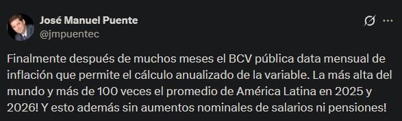 “Finalmente después de muchos meses el BCV publica data mensual de inflación que permite el cálculo anualizado de la variable. La más alta del mundo y más de 100 veces el promedio de América Latina en 2025 y 2026”, escribió.