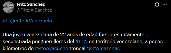 Una joven venezolana de 22 años fue presuntamente secuestrada por guerrilleros del Ejército de Liberación Nacional (ELN) en territorio venezolano, a pocos kilómetros de Puerto Ayacucho, en la troncal 12 del estado Amazonas.