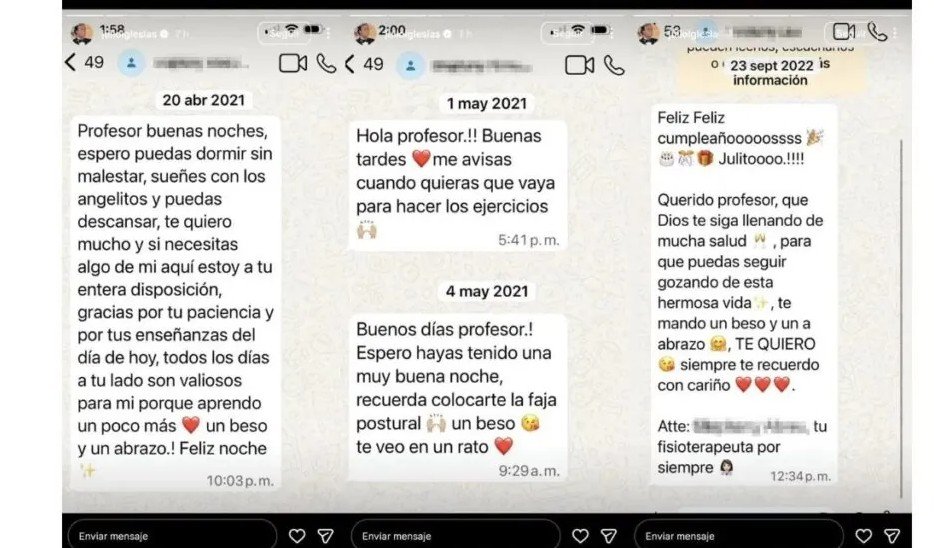 En este contexto, Iglesias ha insistido en el comunicado de ‘Instagram’ que «todo tiene un límite». «Es necesario desenmascarar estas falsedades y contar la verdad», ha reiterado. Finalmente, el cantante ha explicado que adjunta «algunas de las conversaciones» de ‘WhatsApp’ «que ponen de manifiesto la incoherencia de las denuncias y la manipulación mediática» a la que, según ha dicho, está siendo sometido. En concreto, ha publicado varios ‘pantallazos’ con supuestos mensajes de sus exempleadas, fechados en los años 2021, 2022 y 2023.