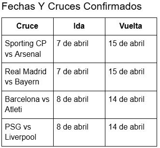UEFA cerró estas series tras el final de los octavos, completados el 18 de marzo. También quedó partido el cuadro en dos carriles muy claros: Sporting CP o Arsenal chocará en semifinales con Real Madrid o Bayern, mientras que el ganador de Barcelona y Atleti irá contra quien salga vivo del duelo entre PSG y Liverpool.