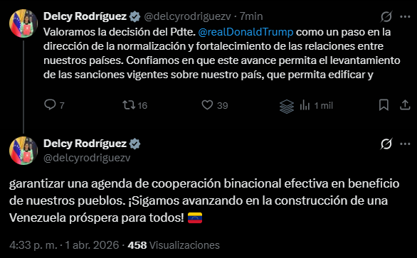 A través de un mensaje publicado en su cuenta oficial de la red social X, Rodríguez expresó su postura frente al reciente levantamiento de las medidas financieras impuestas en su contra desde 2018. “Valoramos la decisión del Pdte. @realDonaldTrump como un paso en la dirección de la normalización y fortalecimiento de las relaciones entre nuestros países”, subrayó.