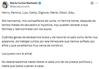 A través de su cuenta en X, Machado resaltó el valor de los activistas que fueron excarcelados y la conexión personal que los une en la actual situación política.