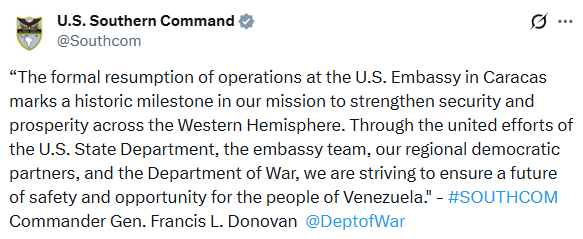 A través de un mensaje publicado en la cuenta oficial de la red social X del Comando Sur, el alto mando militar estadounidense destacó la importancia geoestratégica de este avance tras años de ruptura de relaciones. “La reanudación formal de las operaciones en la Embajada de los EEUU en Caracas marca un hito histórico en nuestra misión de fortalecer la seguridad y la prosperidad en todo el hemisferio occidental”, expresó.