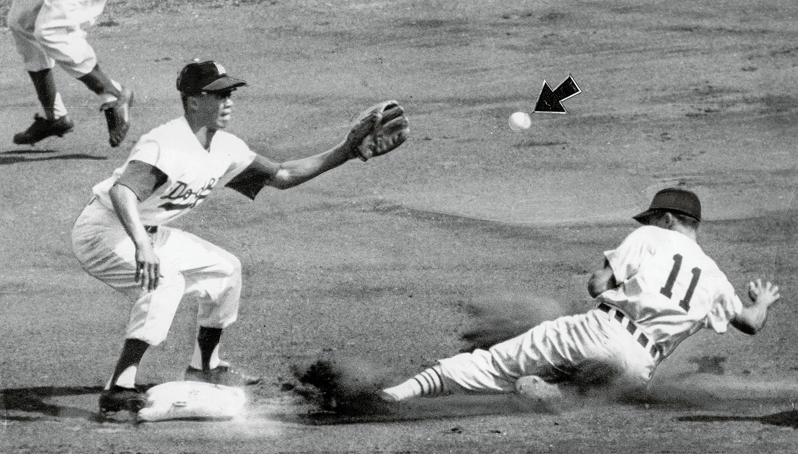 Oct. 5, 1959: White Sox Luis Aparicio steals second ahead of throw to Maury Wills, left, from Wally Moon. Game four of the 1959 World Series. This photo was published in the Oct. 6, 1959 Los Angeles Times.