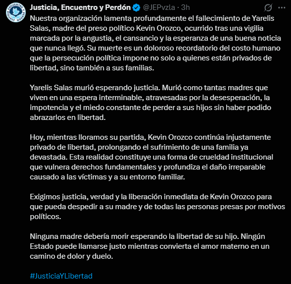 “Ninguna madre debería morir esperando la libertad de su hijo. Ningún Estado puede llamarse justo mientras convierta el amor materno en un camino de dolor y duelo”, concluyó el comunicado, acompañado de la etiqueta #JusticiaYLibertad.