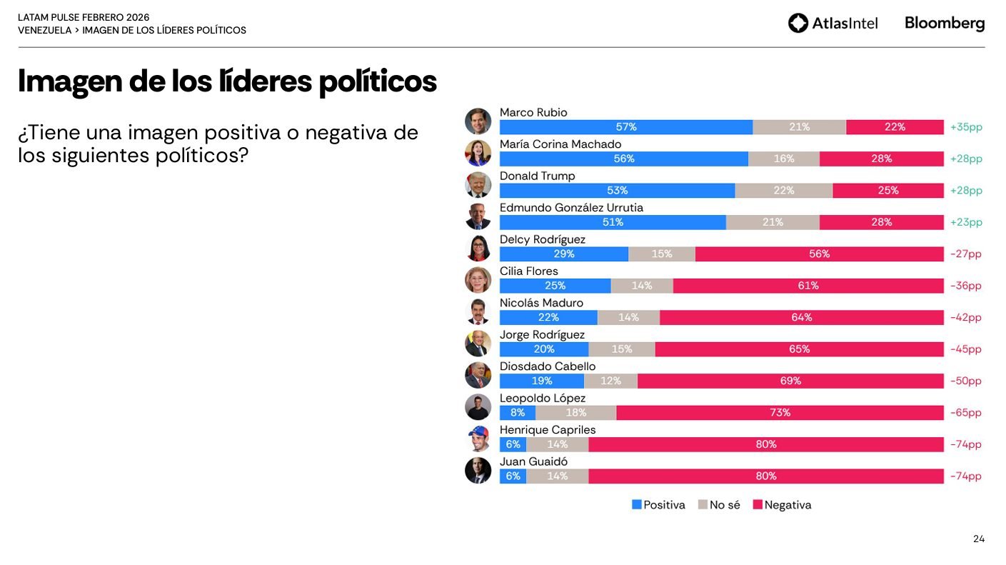 La sucesora temporal en el Palacio de Miraflores, convenida por la Administración Trump, es Delcy Rodríguez. Según la encuesta de AtlasIntel y Bloomberg, la funcionaria chavista cuenta solo con 29% de aprobación y un abrumador rechazo de 56%.