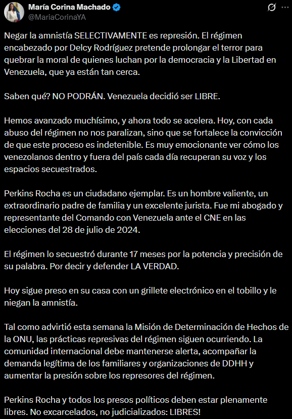 Finalmente, la ganadora del Premio Nobel de la Paz 2025 subrayó que «Perkins Rocha y todos los presos políticos deben estar plenamente libres. No excarcelados, no judicializados: ¡LIBRES! El régimen cree que a través de su ‘justicia’ selectiva demuestra que tiene poder y control; los venezolanos sabemos que en realidad ellos temen a una nación que ha decidido ser libre».
