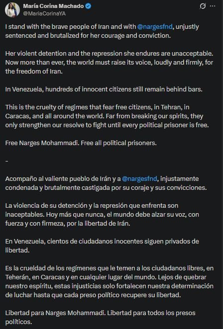 A través de un mensaje compartido en su cuenta de X, Machado condenó la detención y represión que enfrenta Mohammadi, calificándolas como «inaceptables».