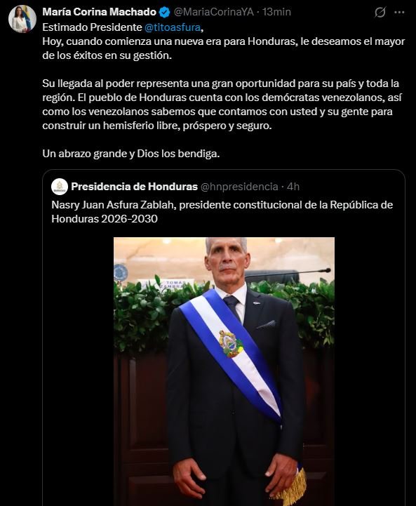 La líder democrática venezolana y Premio Nobel de la Paz, María Corina Machado, envió un mensaje de felicitación al nuevo presidente de Honduras, Nasry “Tito” Asfura, luego de su toma de posesión este martes en el Congreso Nacional de Tegucigalpa, marcando el inicio del periodo presidencial 2026-2030.