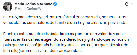 María Corina Machado se pronunció a través de su cuenta en X para respaldar las exigencias de los trabajadores, jubilados y pensionados este 30 de abril.