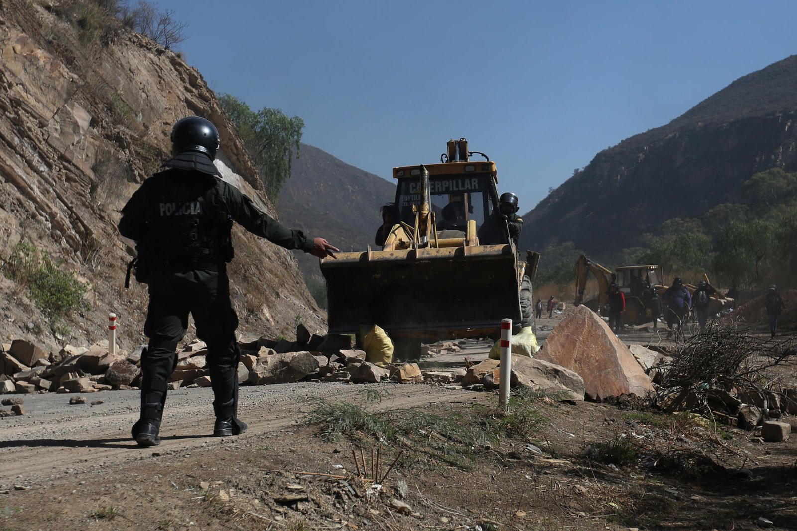 Un miembro de la Policía Boliviana da instrucciones durante un bloqueo de simpatizantes del expresidente de Bolivia, Evo Morales. EFE/ Luis Gandarillas