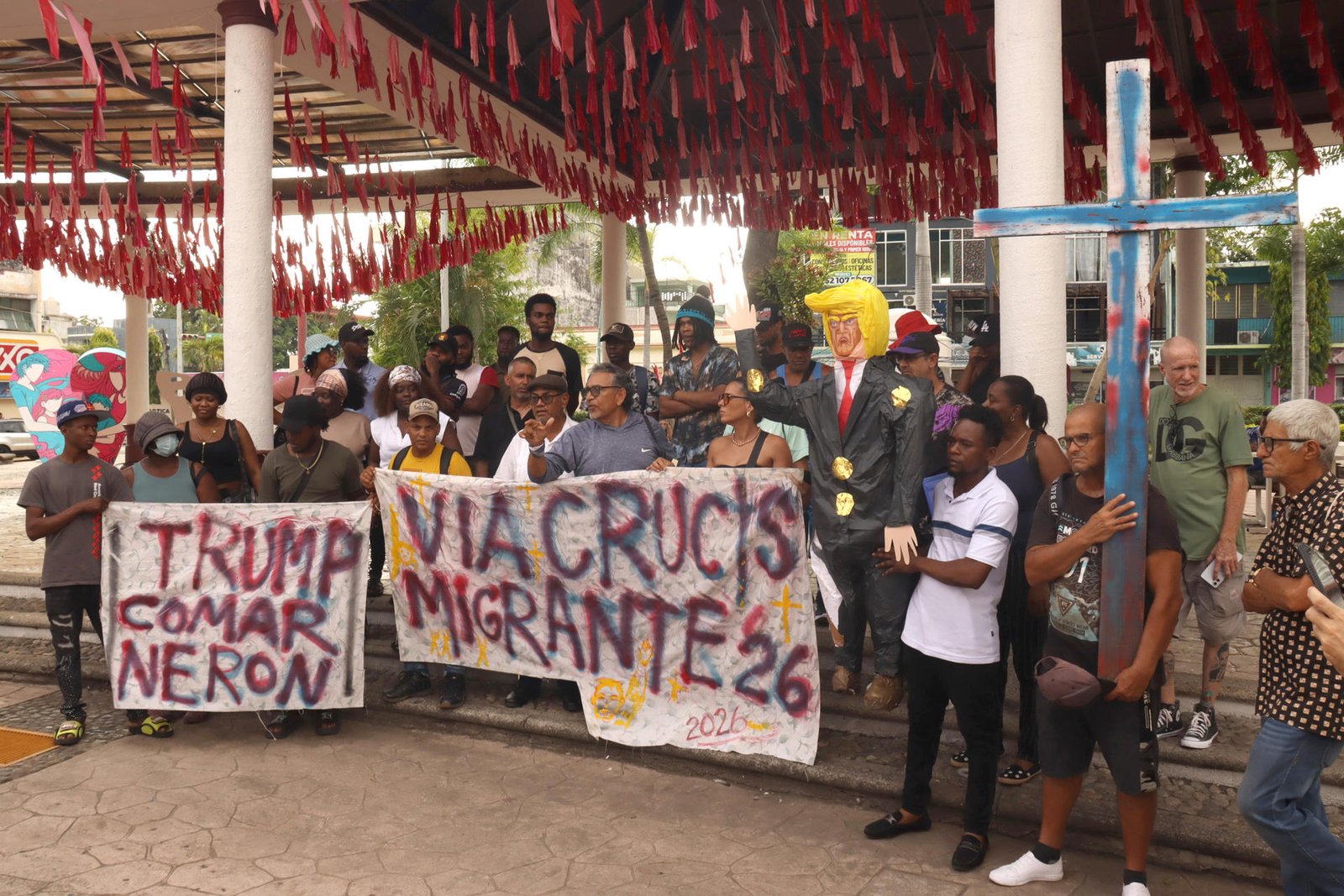 Los manifestantes protestaron contra las políticas del presidente estadounidense Donald Trump, por las que fueron deportaron a Tapachula (Chiapas), donde quemaron una piñata para expresar su malestar y la incertidumbre que enfrentan.