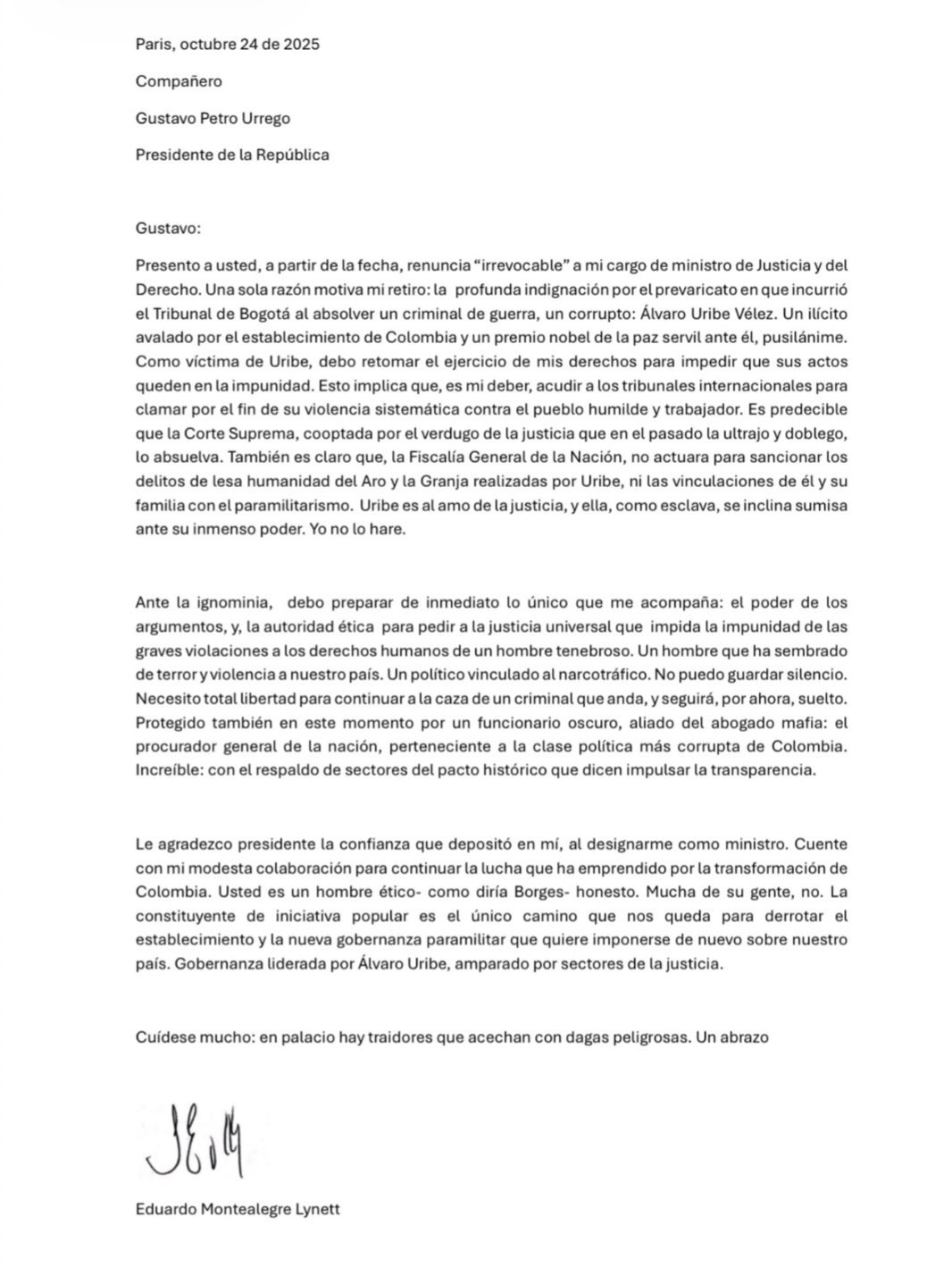 Según expone en la carta Montealegre, su renuncia se debería a la absolución del expresidente Álvaro Uribe en segunda instancia, pues el exfiscal ha reclamado que supuestamente sería víctima de ese proceso.