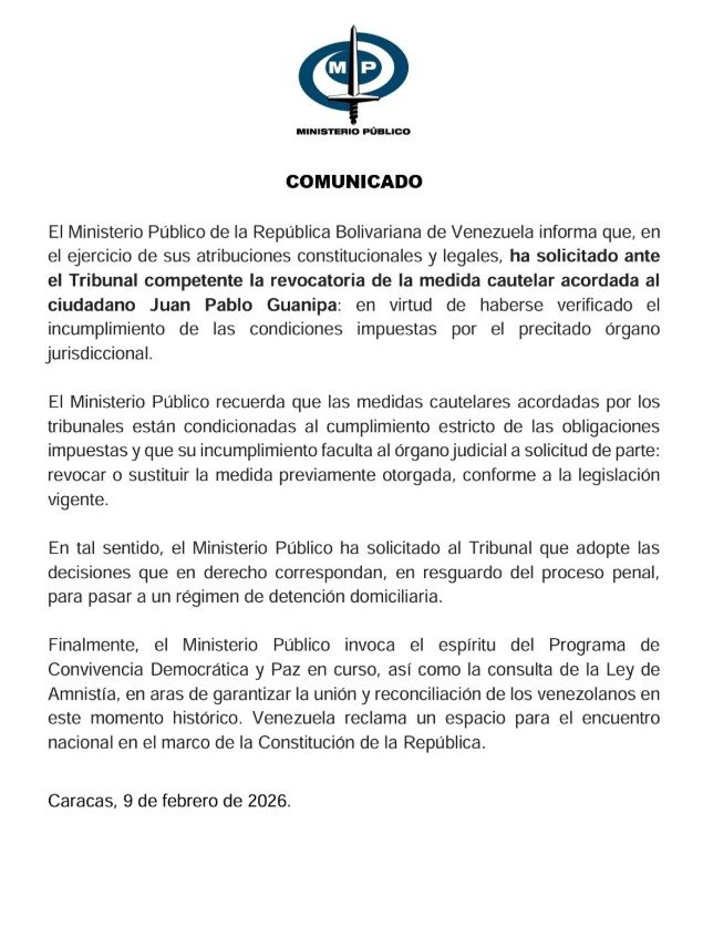 En un comunicado, el Ministerio Público venezolano advirtió que «las medidas cautelares acordadas por los tribunales están condicionadas al cumplimiento estricto de las obligaciones impuestas» y subrayó que ha solicitado que Guanipa pase «a un régimen de detención domiciliaria».