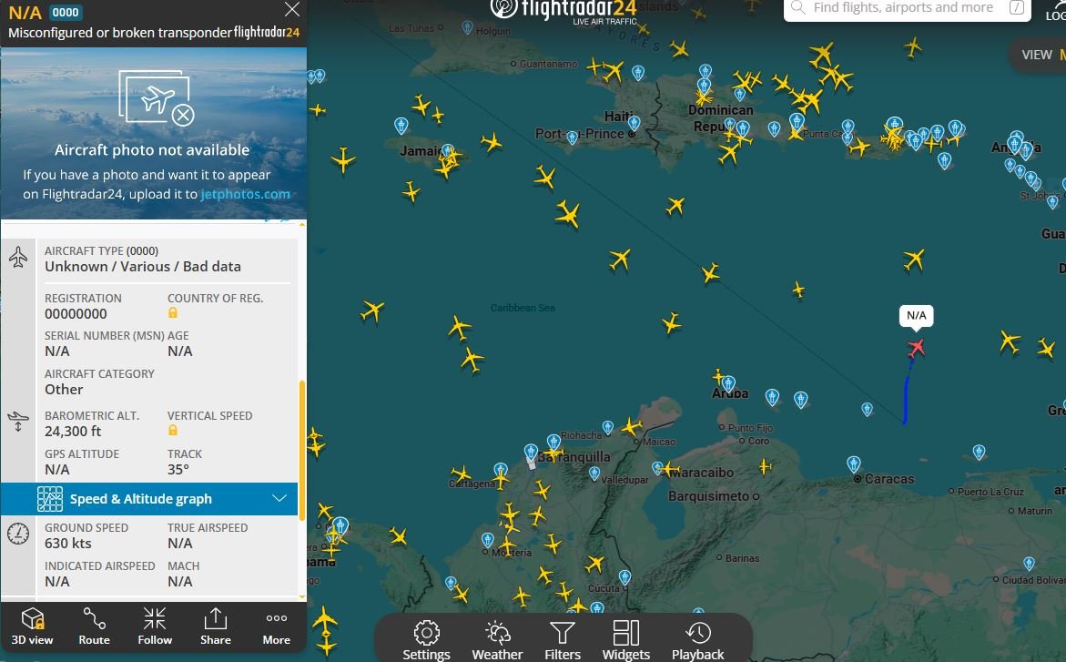 Según los datos captados a las 9:50 PM (HLV), la aeronave apareció identificada con el código genérico «0000» y sin una matrícula oficial visible.
