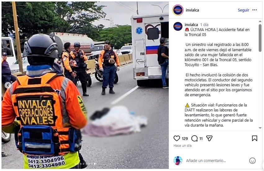 Según el reporte del Instituto Autónomo para la Administración, Mantenimiento y Conservación de la Vialidad (Invialca), el siniestro consistió en una colisión entre dos motos.
