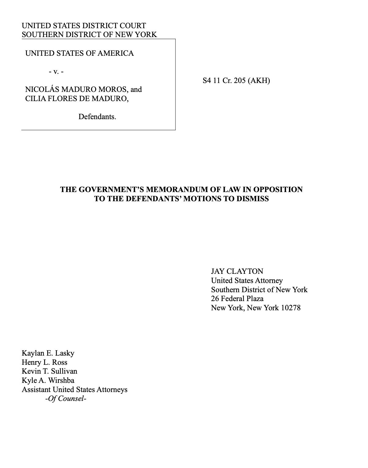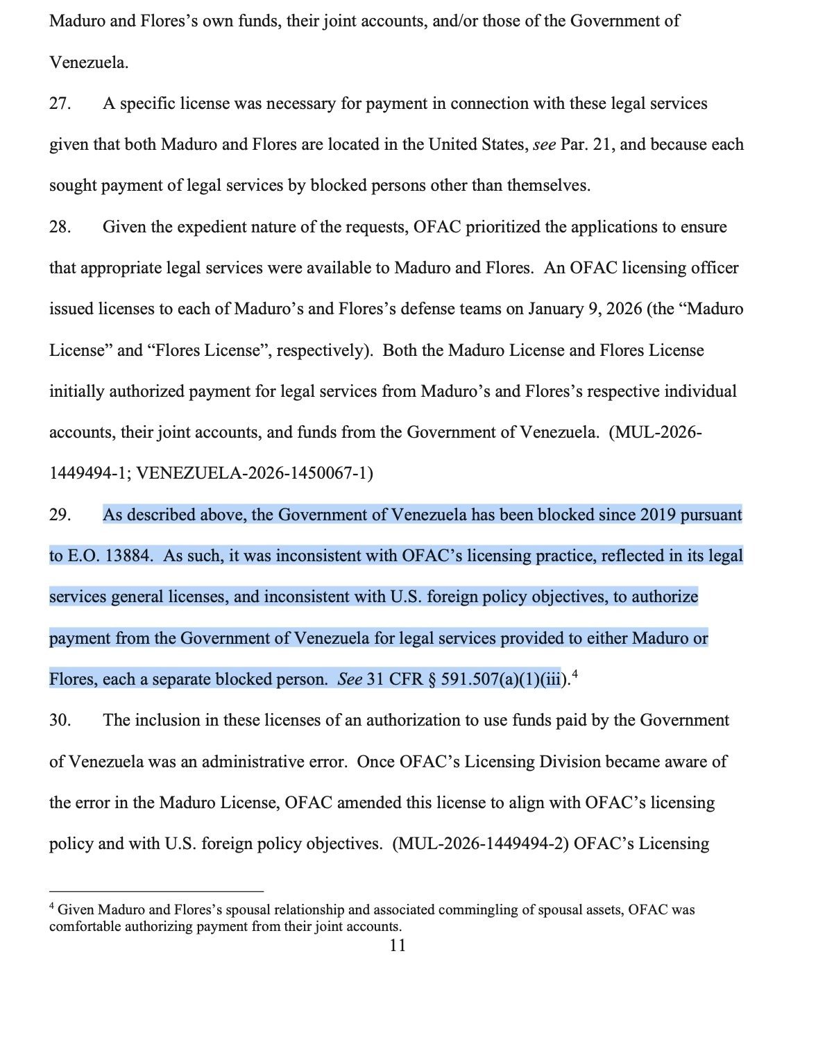 Ante el intento de los abogados de tumbar el caso por esta restricción financiera, la fiscalía neoyorquina respondió de manera contundente y se apegó a la normativa vigente. El memorando detalló que «como se describió anteriormente, el Gobierno de Venezuela ha estado bloqueado desde 2019 en virtud de la Orden Ejecutiva 13884. Como tal, era inconsistente con la práctica de concesión de licencias de la OFAC (…) e inconsistente con los objetivos de política exterior de EEUU, autorizar el pago del Gobierno de Venezuela por servicios legales prestados a Maduro o Flores».