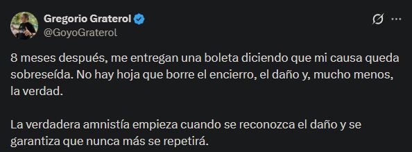 A través de una publicación en su cuenta de X, Graterol señaló que recibió la notificación oficial de su caso ocho meses después de su excarcelación.