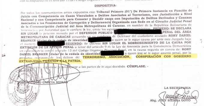 El juez encargado dejó claro que no hay amnistía para los delitos que le imputan a Rory: terrorismo, asociación, conspiración con gobierno extranjero y traición a la patria. Según el artículo 9 de la Ley de Amnistía para la Convivencia Democrática, estos casos quedan fuera.