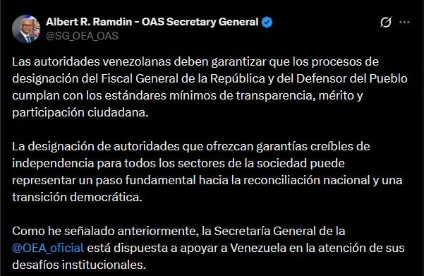 El secretario general de la Organización de Estados Americanos (OEA), Albert Ramdin, instó a las autoridades en Venezuela a cumplir los “estándares mínimos de transparencia” para la elección de los cargos de Fiscal General de la República y Defensor del Pueblo.