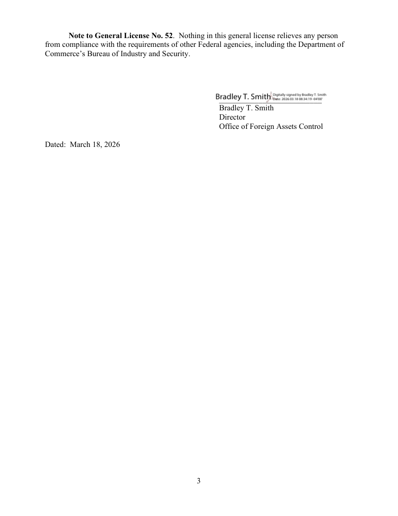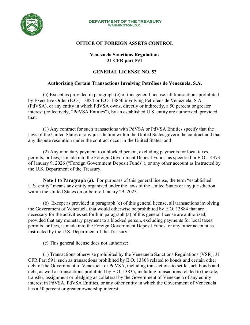 Asimismo, cualquier pago a una persona bloqueada (excluyendo impuestos locales, permisos o tasas) debe depositarse en los Fondos de Depósito del Gobierno Extranjero (Foreign Government Deposit Funds), según lo establecido en la Orden Ejecutiva 14373 del 9 de enero de 2026, o en otra cuenta indicada por el Departamento del Tesoro.