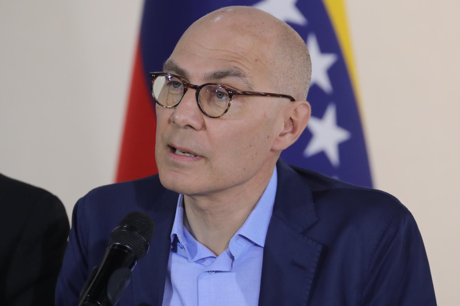El Alto Comisionado de Derechos Humanos de ONU (Acnudh), Volker Türk, participa en una rueda de prensa en el Aeropuerto Simón Bolívar, hoy en Caracas (Venezuela). La Oficina de Alto Comisionado de Derechos Humanos de ONU (Acnudh) tendrá presencia dos años más en Venezuela, anunció este sábado el funcionario que encabeza esta instancia, Volker Türk, durante la conferencia de prensa que ofreció al término de su misión oficial en Caracas. EFE/ Miguel Gutiérrez