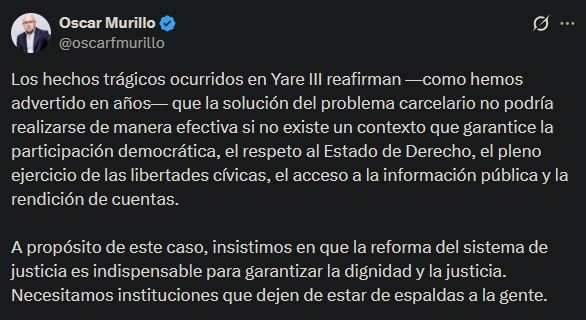 “Los hechos trágicos ocurridos en Yare III reafirman —como hemos advertido— que la solución del problema carcelario no podría realizarse de manera efectiva si no existe un contexto que garantice la participación democrática, el respeto al Estado de Derecho, el pleno ejercicio de las libertades cívicas, el acceso a la información pública y la rendición de cuentas”, escribió.