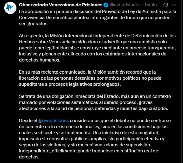 El Observatorio Venezolano de Prisiones (OVP) fijó una postura crítica tras la aprobación en primera discusión del Proyecto de Ley de Amnistía en la Asamblea Nacional chavista.