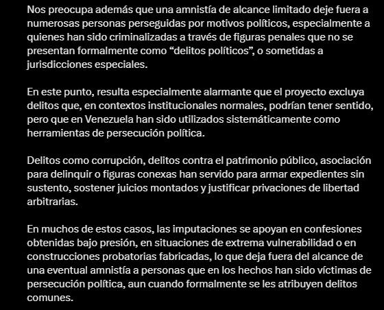 Uno de los puntos más alarmantes señalados por el OVP es la exclusión de delitos que han sido instrumentalizados por el sistema judicial venezolano para perseguir disidentes. Según la ONG, el proyecto actual podría ignorar a quienes enfrentan cargos de: Corrupción y delitos contra el patrimonio público. Asociación para delinquir y figuras conexas utilizadas para «armar expedientes sin sustento».