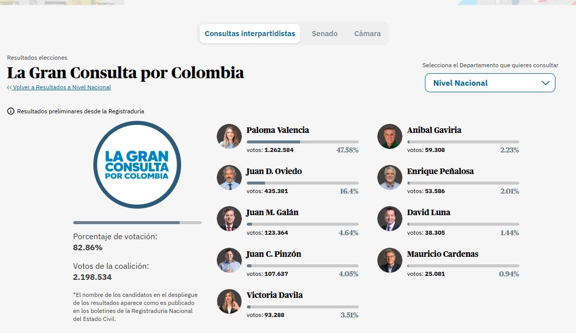 De acuerdo con los resultados preliminares difundidos por el diario El Tiempo, en la llamada “Gran Consulta por Colombia”, Valencia logró 1.262.584 votos, equivalentes al 47,58 %, una ventaja contundente frente a sus contendores.