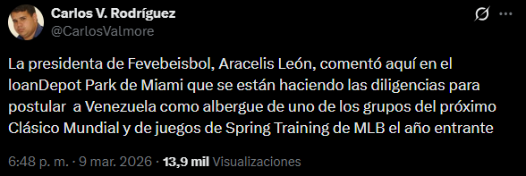 «La presidenta de Fevebeisbol, Aracelis León, comentó aquí en el loanDepot Park de Miami que se están haciendo las diligencias para postular a Venezuela como albergue de uno de los grupos del próximo Clásico Mundial y de juegos de Spring Training de MLB el año entrante», escribió el periodista.