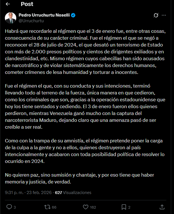 En un mensaje contundente publicado en la noche de este lunes 23 de febrero en su cuenta oficial de X, Pedro Urruchurtu, director de Relaciones Internacionales de la líder opositora venezolana y Premio Nobel de la Paz, María Corina Machado, volvió a mencionar lo ocurrido el 3 de enero de 2026.
