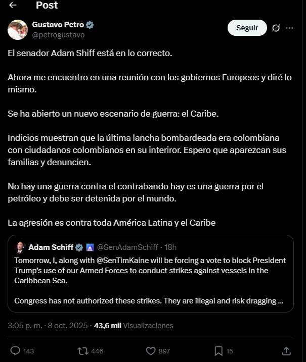 Petro compartió en su cuenta de X una publicación del senador demócrata por California Adam Schiff anunciando que junto a su colega Tim Kaine impulsarán una votación en el Congreso estadounidense para bloquear el uso que hace el presidente Donald Trump de las Fuerzas Armadas «para llevar a cabo ataques contra embarcaciones en el mar Caribe».