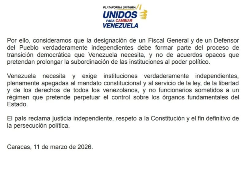 Para la alianza opositora, la autonomía del Ministerio Público y la Defensoría del Pueblo es un requisito indispensable para cualquier proceso real de democratización y justicia en Venezuela.