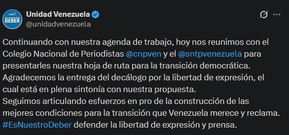 A través de una publicación en su cuenta de X, la coalición opositora señaló que la reunión formó parte de su agenda de trabajo y que el objetivo fue compartir su propuesta con los gremios de la prensa en el país.