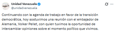 La Plataforma Unitaria Democrática informó este 11 de febrero sobre el desarrollo de un encuentro con el embajador de Alemania en Venezuela, Volker Pellet.