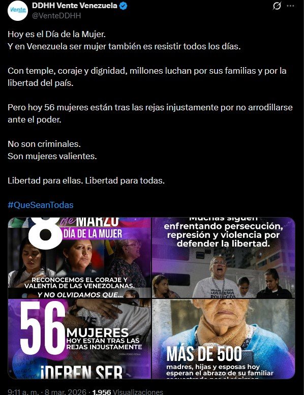 En una publicación en X, el partido Vente Venezuela (VV), liderado por Machado, subrayó la valentía de las mujeres venezolanas que «luchan a diario por mantener a la familia unida y por un país libre».