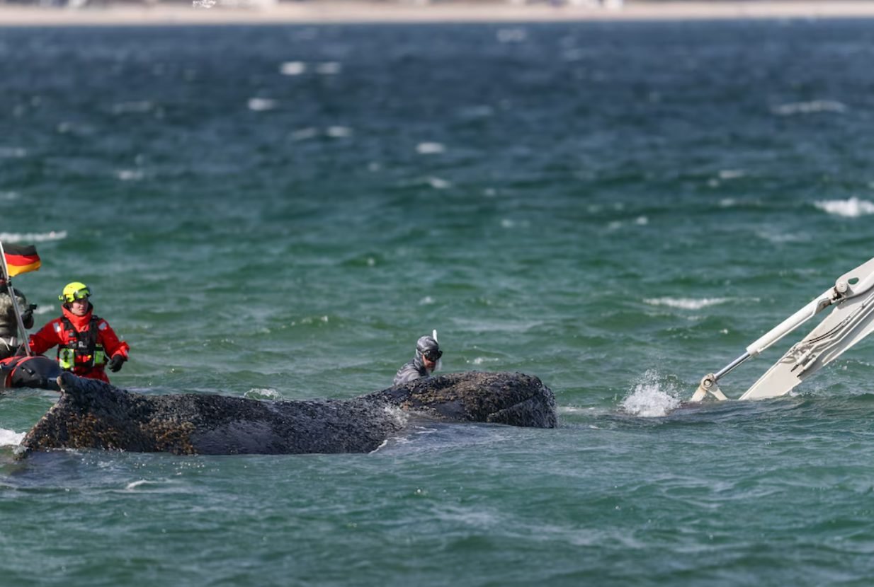 La ballena logró liberarse por primera vez por sus propios medios en la noche del jueves al viernes, después de que equipos de rescate excavaron con una draga un canal en el banco de arena en el que llevaba atrapada desde el lunes en la bahía de la ciudad alemana de Lübeck, en el estado federado de Schleswig-Holstein.