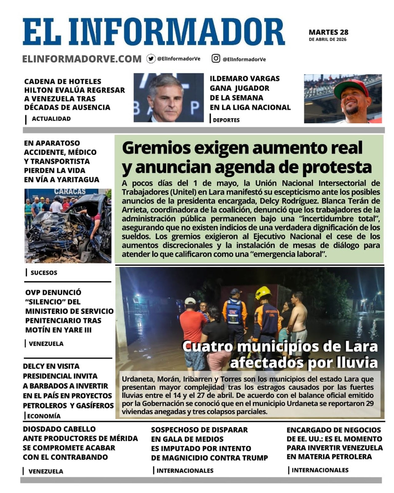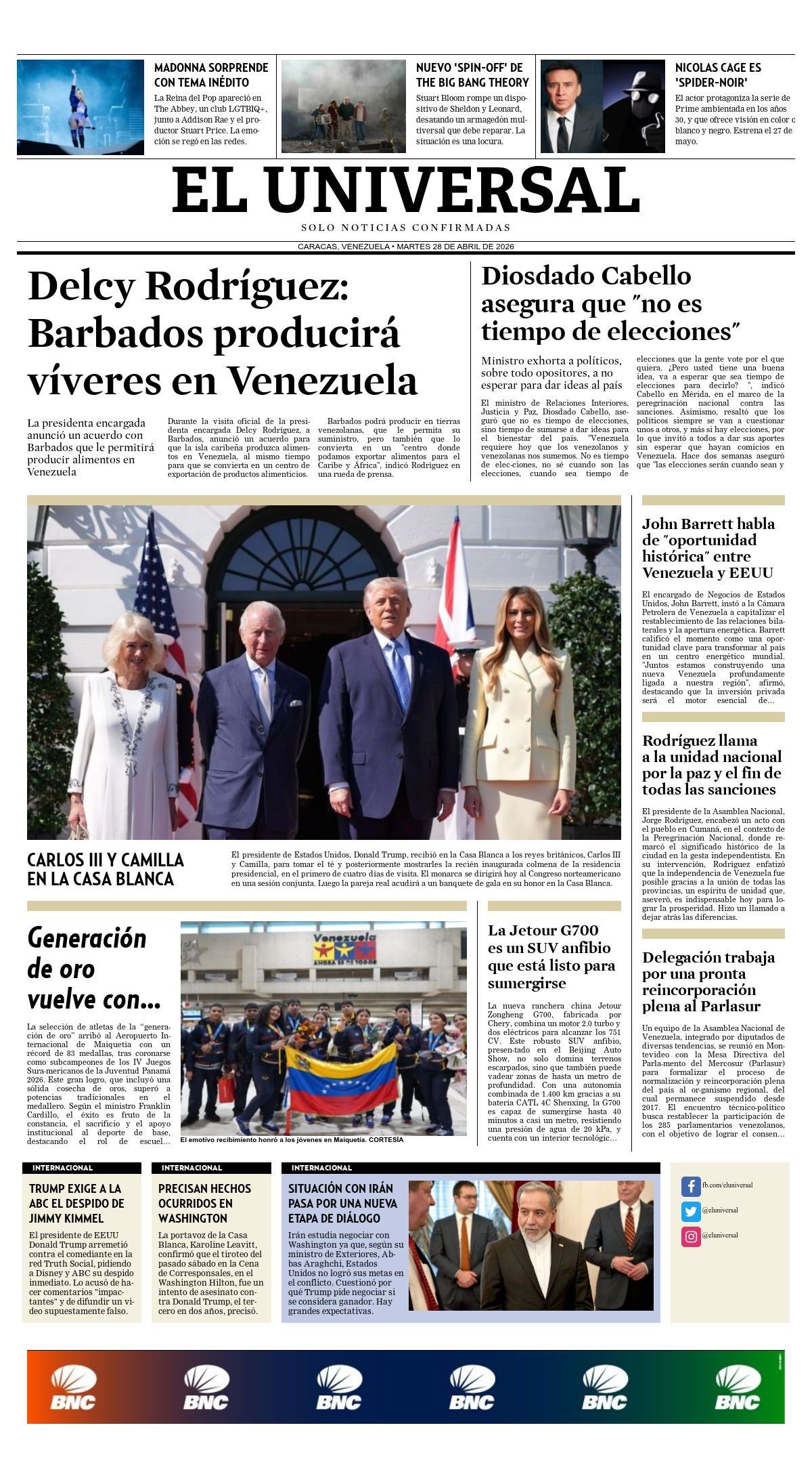 PortadasPortadas de este martes 28 de abril de 2026 Por VenezuelanTimeabril 28, 202605 La noticia no descansa y nosotros tampoco ¡Únete a nuestro Centro Informativo en WhatsApp!