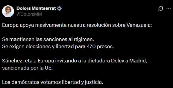 “Europa apoya masivamente nuestra resolución sobre Venezuela: Se mantienen las sanciones al régimen. Se exigen elecciones y libertad para 470 presos. Sánchez reta a Europa invitando a la dictadora Delcy a Madrid, sancionada por la UE. Los demócratas votamos por la libertad y justicia”, publicó la diputada del Parlamento Europeo a través de su cuenta en X.