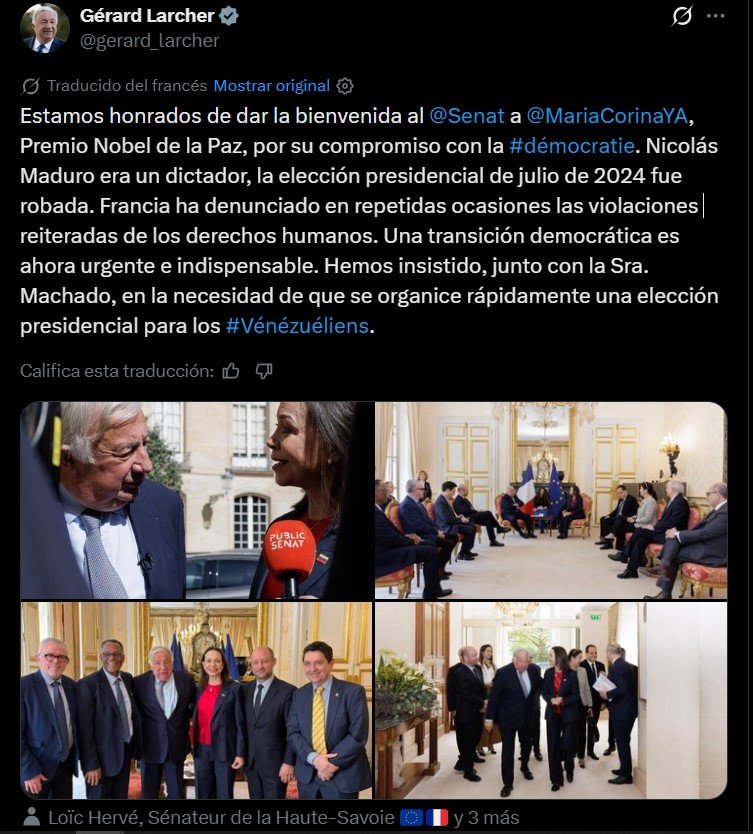 A través de su cuenta en la red social X, Larcher aseguró que fue un honor recibir en la sede del Senado a Machado, a quien reconoció por su “compromiso con la democracia”. En su mensaje, fue directo al referirse al fraude de 2024: “La elección presidencial de julio de 2024 fue robada”, escribió, al tiempo que reiteró que Francia ha denunciado en múltiples ocasiones las violaciones de derechos humanos en Venezuela.