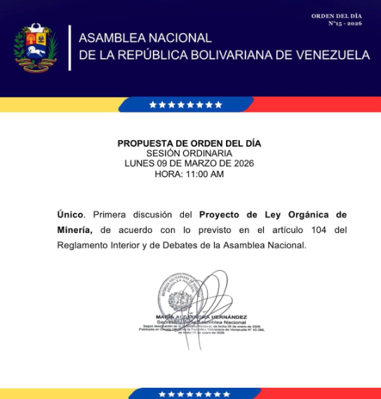 La Asamblea Nacional tiene previsto realizar este lunes, 9 de marzo de 2026, la primera discusión del Proyecto de Ley Orgánica de Minería.