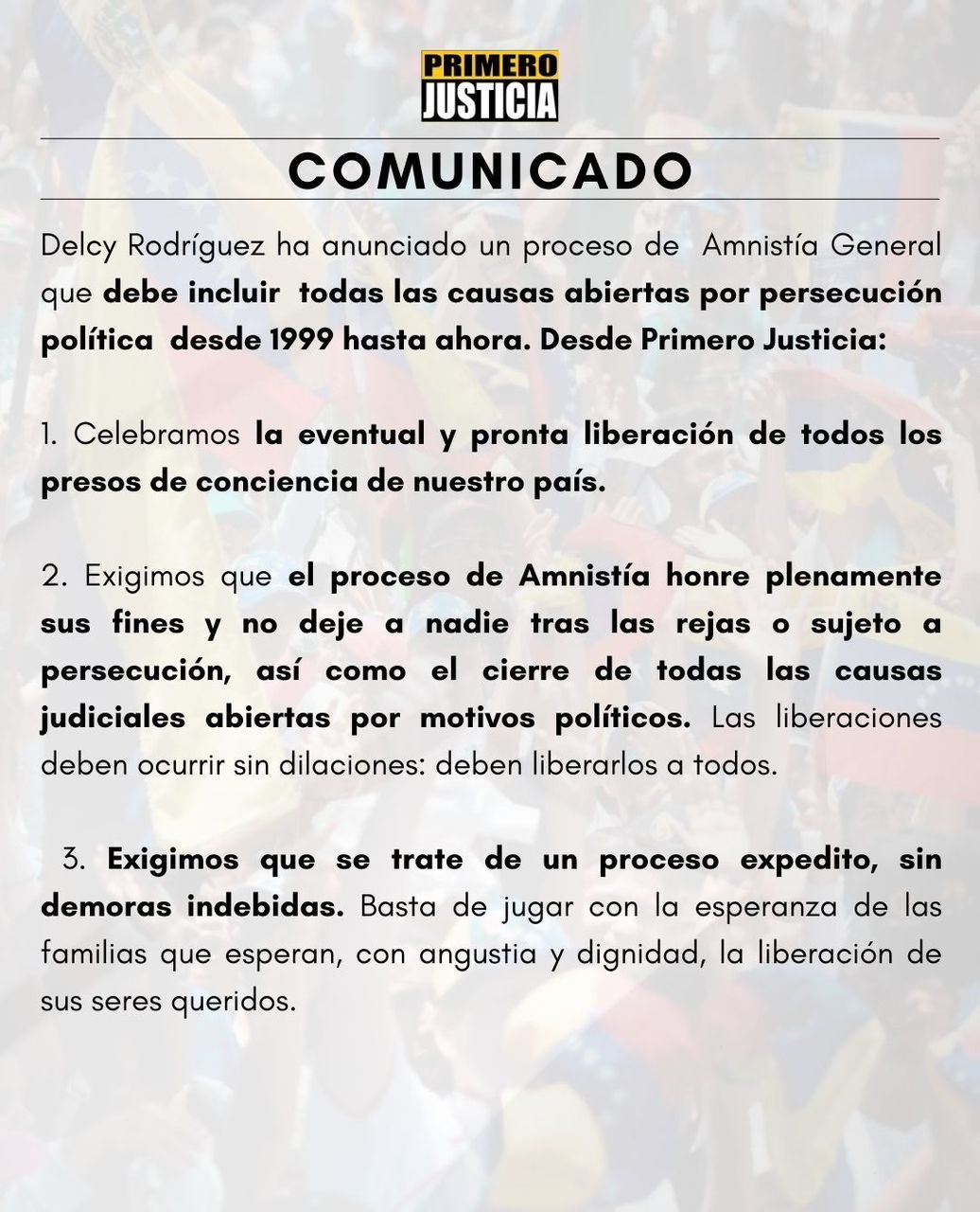 En un comunicado compartido en sus redes sociales, la organización celebró la posibilidad de excarcelaciones tras el anuncio hecho por Delcy Rodríguez, pero advirtió que la amnistía debe honrar plenamente sus fines y no convertirse en un proceso parcial ni dilatado. “Las liberaciones deben ocurrir sin dilaciones: deben liberarlos a todos”, subrayó la tolda política.