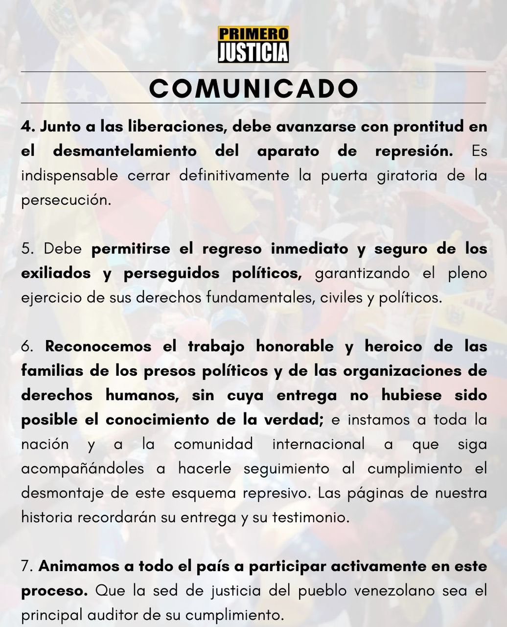 Primero Justicia exigió que el proceso sea expedito y transparente, y reclamó el fin de lo que calificó como la “puerta giratoria de la persecución”, al tiempo que instó al desmantelamiento del aparato represivo del Estado para evitar nuevas detenciones arbitrarias.
