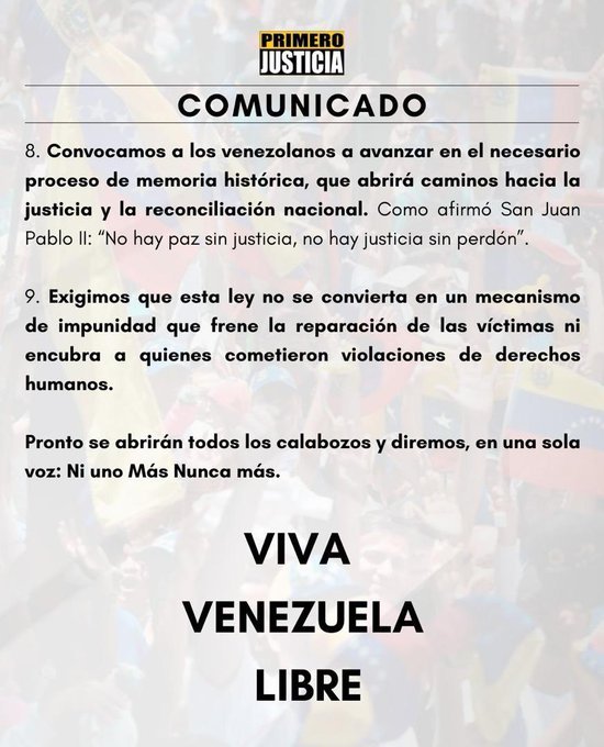 El partido Primero Justicia (PJ) pidió este viernes que el anunciado proyecto de ley de amnistía general incluya el cierre de todas las causas judiciales abiertas por persecución desde 1999, así como la liberación inmediata y sin exclusiones de todos los presos políticos.
