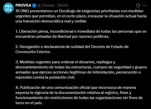 Un total de 16 organizaciones de la sociedad civil, entre ellas el Programa Venezolano de Educación-Acción en Derechos Humanos (Provea), hicieron público este martes 20 de enero, un Decálogo de exigencias prioritarias con medidas urgentes para encauzar la situación política y de derechos humanos en Venezuela hacia una transición democrática real y creíble, según un comunicado oficial compartido en la red social X.