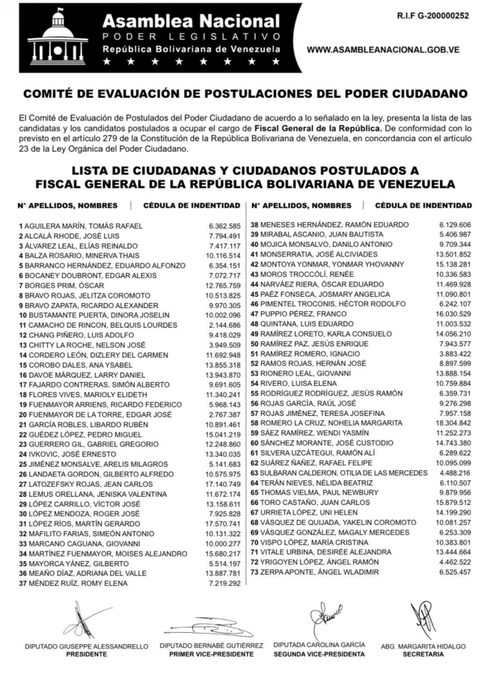 En los nombres que más resaltan para el puesto de fiscal, destacan la especialista en derecho penal Magaly Vásquez, el exjuez superior de la Corte de Apelaciones Penales de Caracas Ángel Zerpa, el Magistrado de la Sala de Casación Social del Tribunal Supremo de Justicia Danilo Mojica, el exdiputado del Congreso Nelson Chitty La Roche y el actual Fiscal encargado, Larry Devoe.