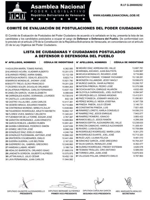 Por su parte, para el cargo de Defensor del Pueblo, los candidatos con mayor renombre son exprocurador general de la República Luis Beltrán Guerra, la abogada laborista Arleth Figueredo, el actual coordinador Académico y de Gestión de la Escuela de Educación de la Ucab Carlos Calatrava, el abogado Vladimir Alvarado Acuña, y el actual ministro de Cultura, Ernesto Villegas.
