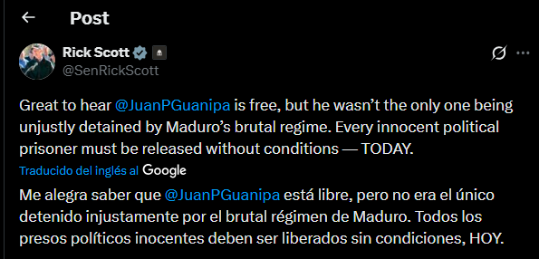 En un mensaje difundido en la tarde, Scott dijo: “Me alegra saber que @JuanPGuanipa está libre, pero no era el único detenido injustamente por el brutal régimen de Maduro. Todos los presos políticos inocentes deben ser liberados sin condiciones, HOY.”