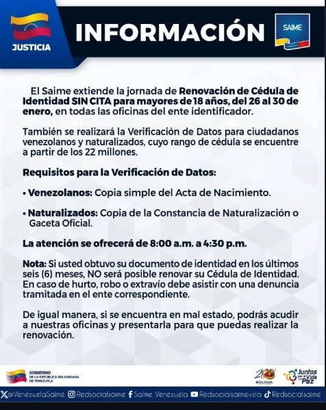 El Servicio Administrativo de Identificación, Migración y Extranjería (Saime) informó este domingo que desde este lunes 26 hasta el viernes 30 de enero se llevará a cabo jornadas de cedulación sin cita en todo el país.